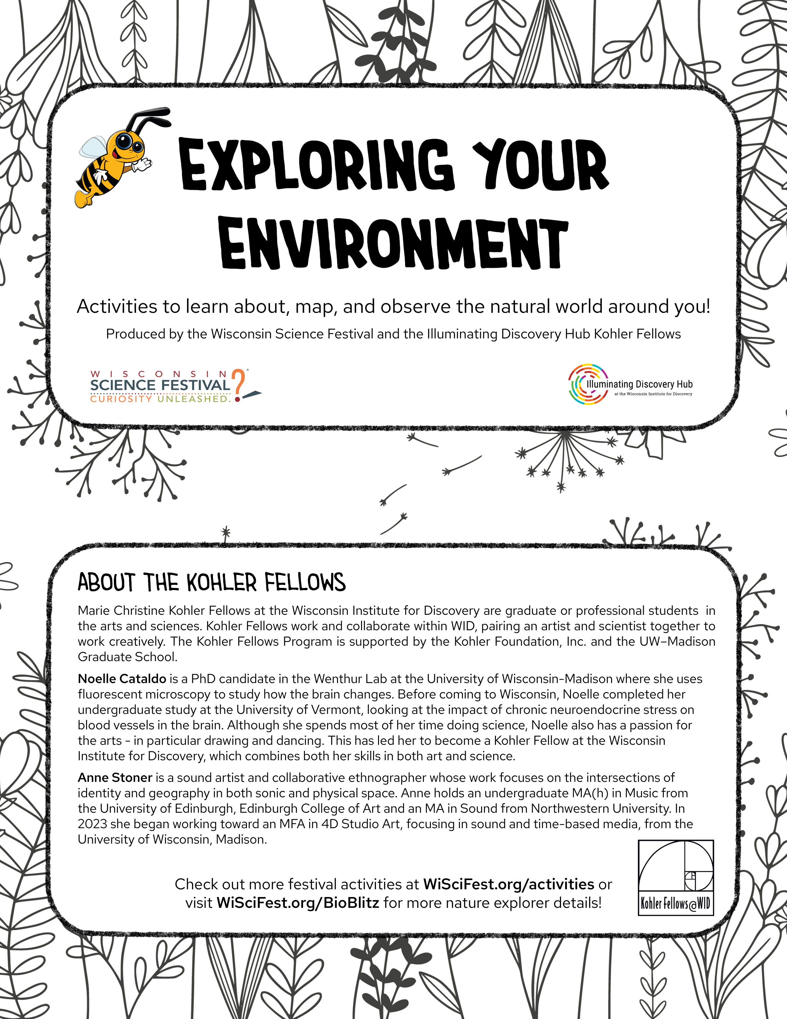The 2025 project on iNaturalist will begin on Thursday, October 16th at sunrise and go until Sunday, October 26th at sunset. Download the BioBlitz worksheet below to document your observations and share them with the festival by emailing a photo of your worksheet to info@wiscifest.org. Also, download our fun Exploring Your Environment activity book filled with more ways to engage with the world around you!